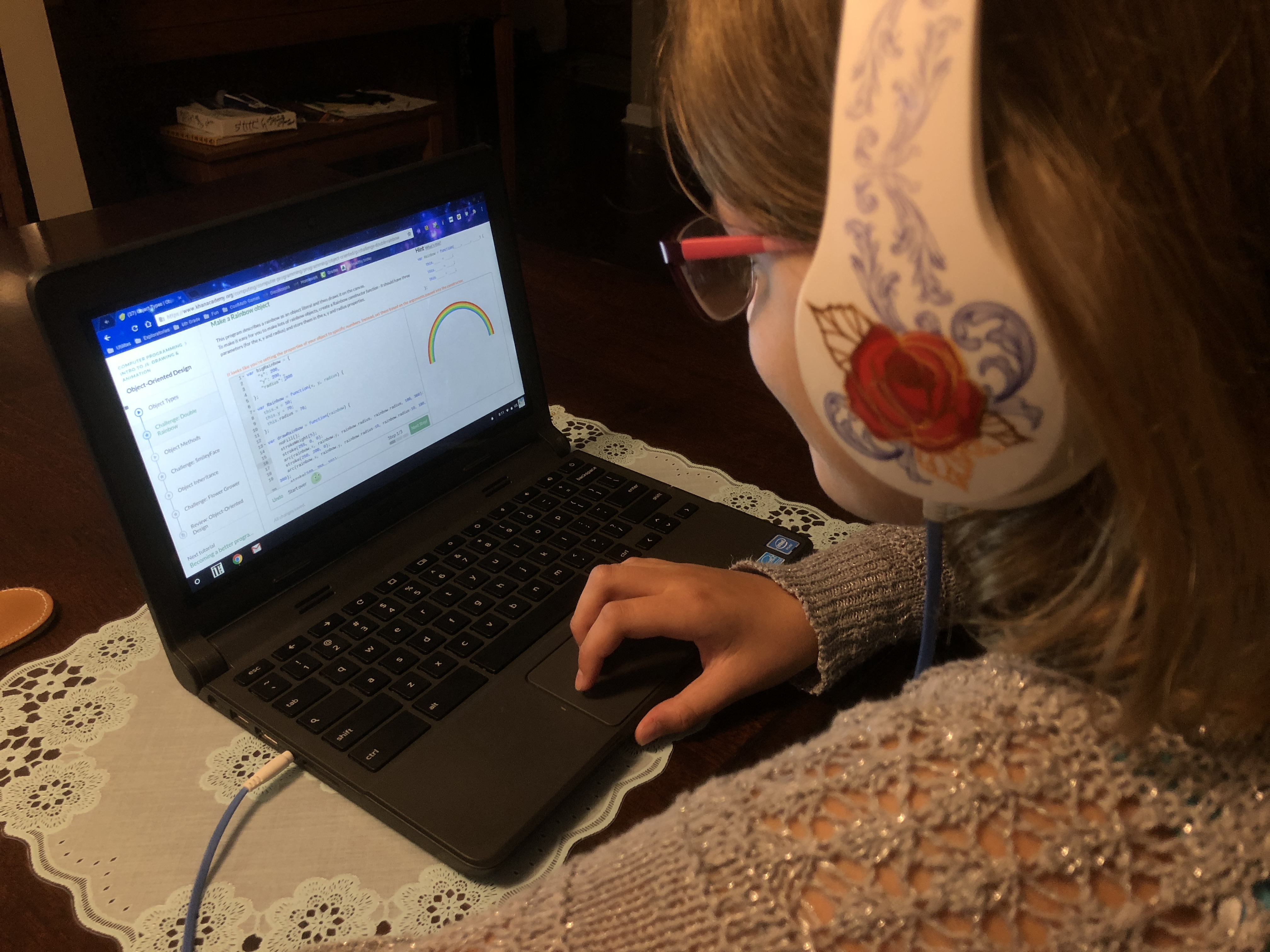 The Scratch interface is powerful enough to keep the attention of youth for quite some time. My daughter started with Scratch Jr. in grade school and continues to use Scratch for creating materials for middle-school projects and presentations. Just recently, she developed a Victorian Etiquette animated presentation with voice-overs, background music, user interactivity, and multiple camera views. At one point during the presentation, there was a bug (there always is a bug), and she paused the animation to open up the code for a quick fix. The classroom “ooo’d” and “ahhh’d” with the impressive back-end programming required. Now, for a middle-schooler, that is professional development at its best.